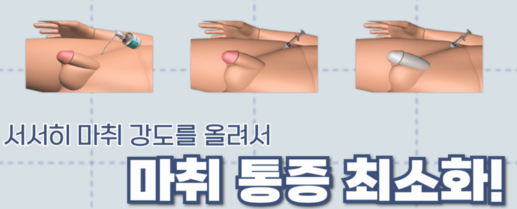 수술 전 성기 부위에 반드시 마취를 하게 됩니다. 성기에 주사를 맞아야 한다는 생각만으로도 많은 분들이 극심한 공포를 느끼시곤 합니다. 저희 병원에서는 이러한 통증을 최소화하기 위해 다음과 같은 방법으로 단계별 마취를 시행하고 있습니다.